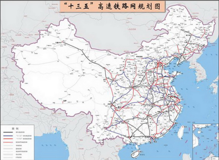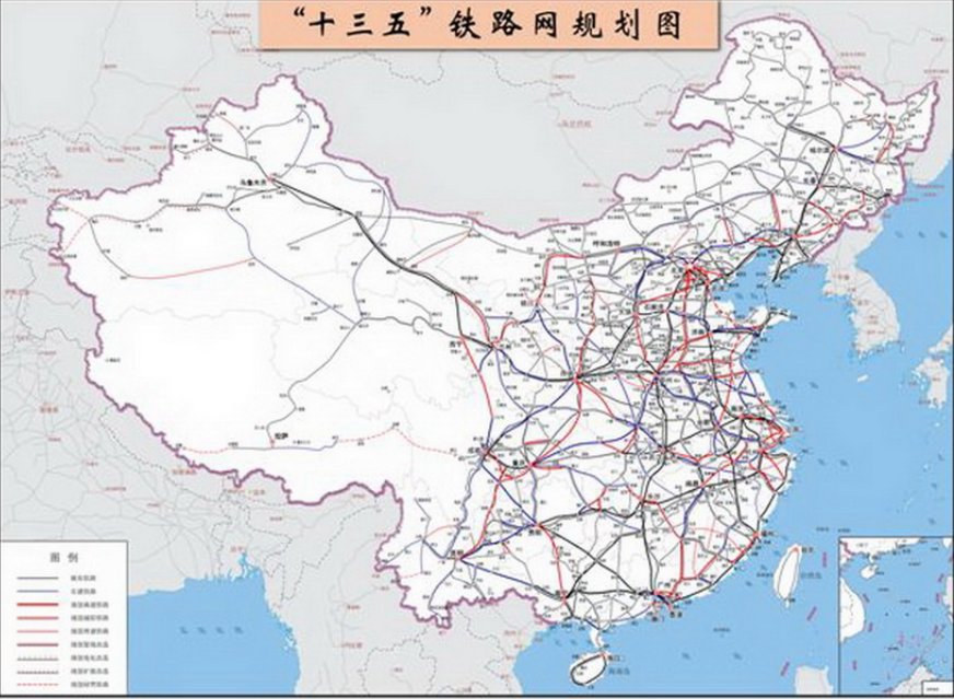 優化干線鐵路網絡布局,推進主要城市群之間區際干線鐵路建設,以中西部地區為重點,拓展中西部路網覆蓋面。完善東部路網,實施既有線改造,盤活路網資源,提升路網質量和效益。研究推進沿邊鐵路建設。
